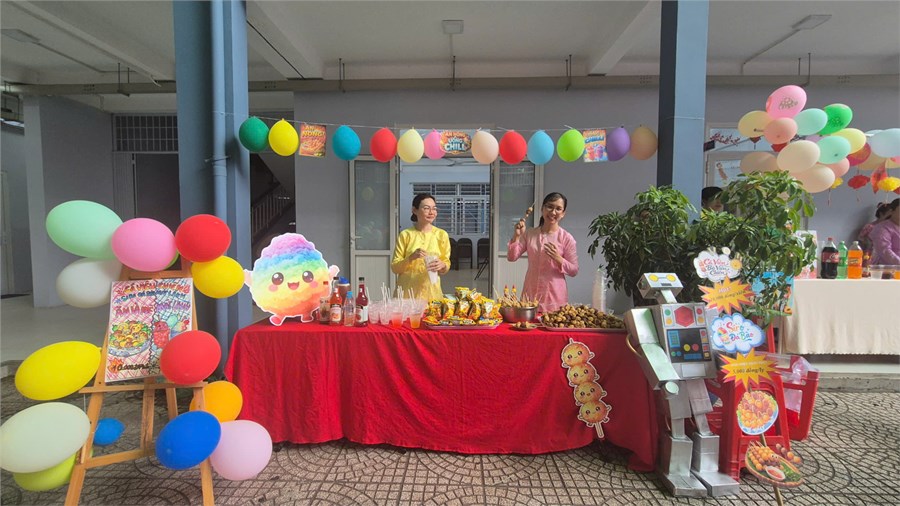 Ngay từ sáng sớm, sân trường đã ngập tràn sắc xuân với cờ hoa, bong bóng, tiểu cảnh trang trí rực rỡ. Học sinh các khối lớp trong trang phục tươi tắn, nhiều em diện áo dài truyền thống, háo hức tham gia các hoạt động dưới sự hướng dẫn tận tình của thầy cô và tình nguyện viên.